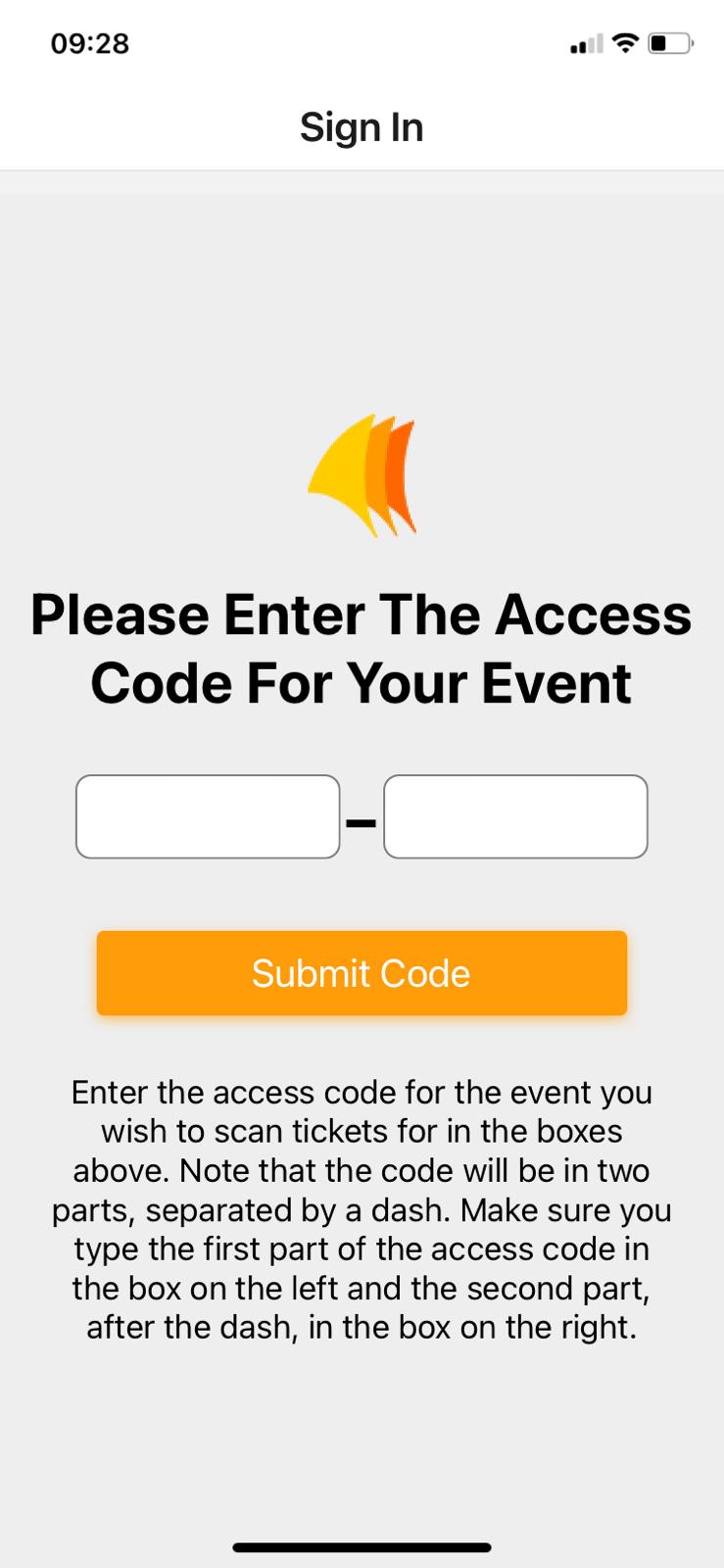 When you first launch the app you will be presented with the screen below where you will be prompted to enter the Access Code for the event that you wish to scan the tickets. Note: The event organiser must tell you the Access Code in advance. The access code is divided into two parts, enter the first part in the box on the left, and the second part in the box on the right. If the event organiser has added a password to the event, then you will be prompted to enter it.