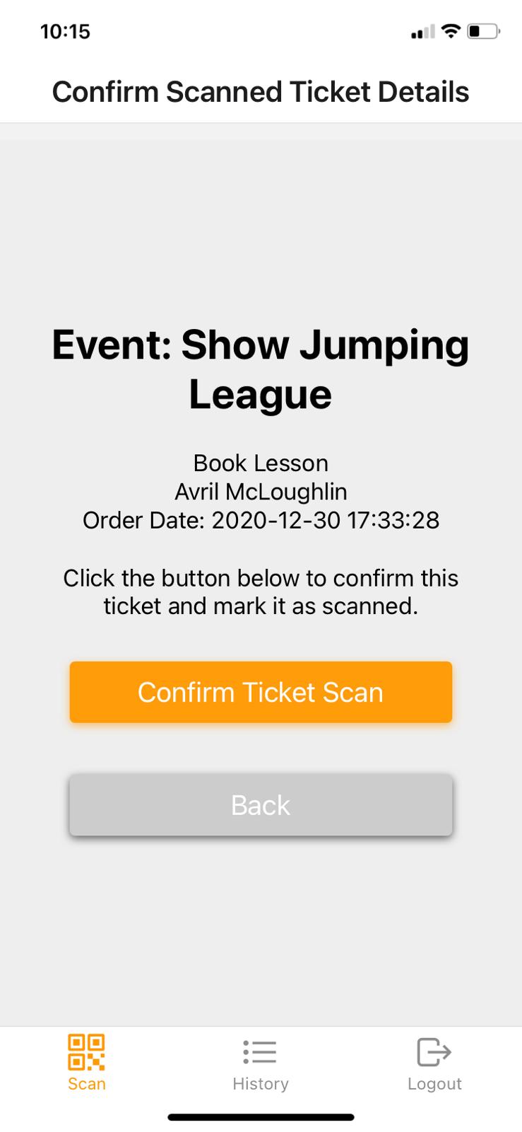The App will read the QR code, and validate it. Assuming it is a valid ticket then you can check the ticket details, and then tap the "Confirm Ticket Scan" button to complete the process.