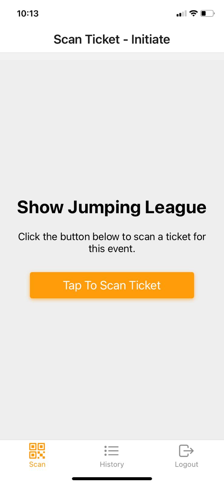 Once logged in you will be presented with the screen below. To scan a ticket, you tap the orange Tap To Scan Ticket button which will bring you to the Scan Ticket screen, also shown below.